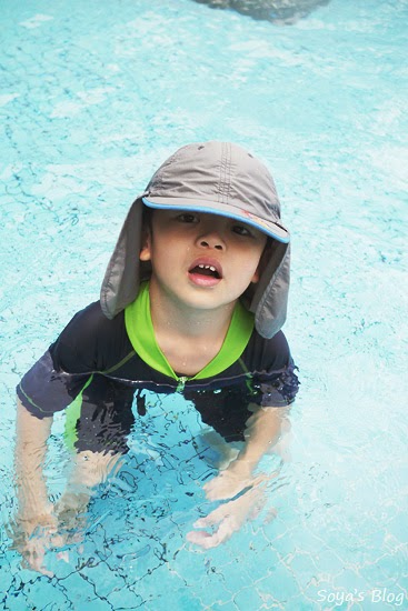 小豆子對於游泳池有莫名的恐懼,告訴他其實小人用的泳池只有到他的肚子,慢慢誘導後,最後他也玩的很快樂。